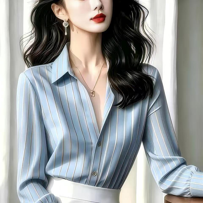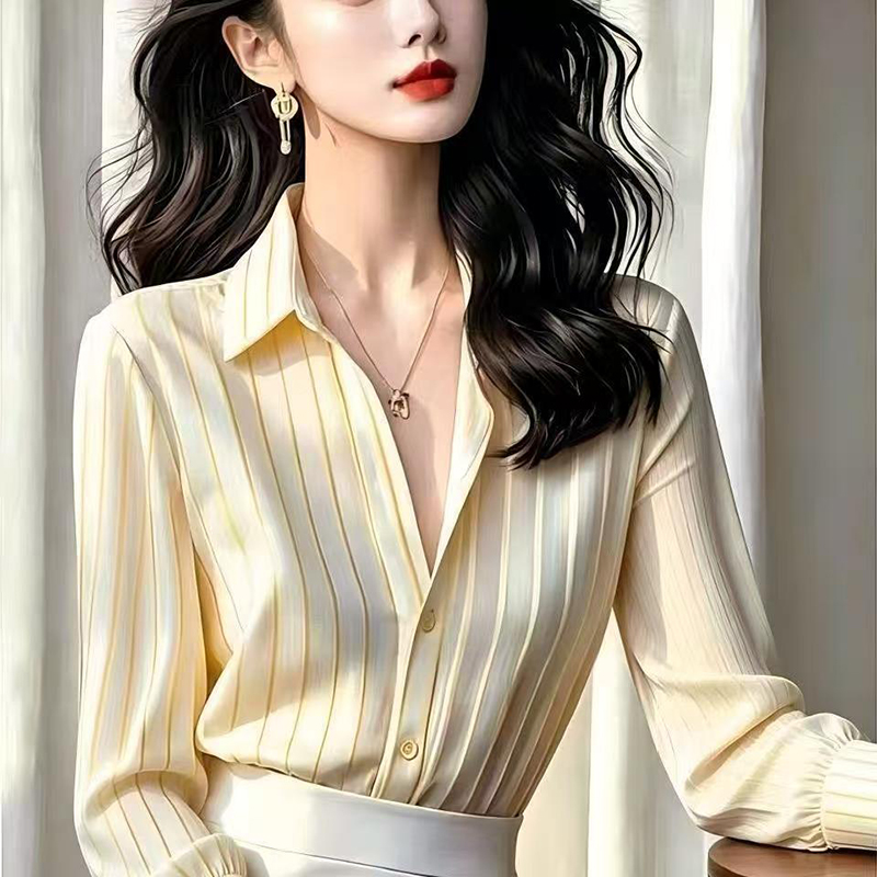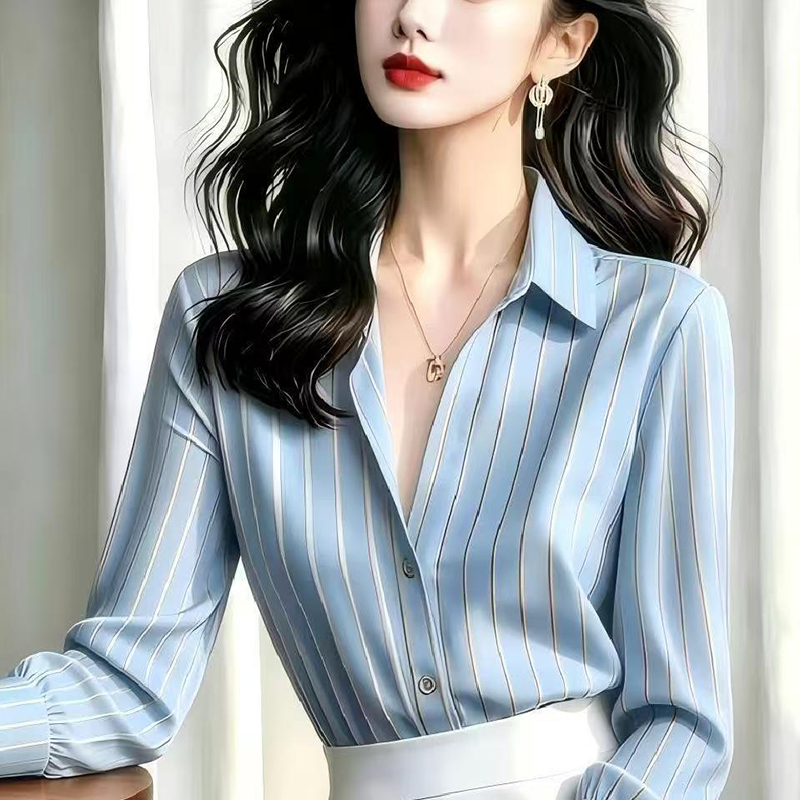 YF7559-(2色入内)高级感时尚蓝色条纹泡泡袖POLO领宽松显瘦漂亮法红式衬衣