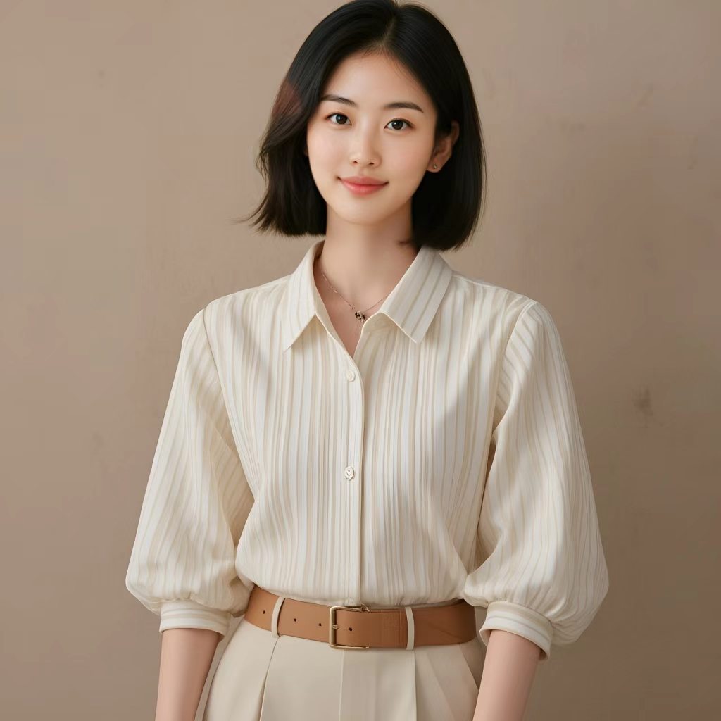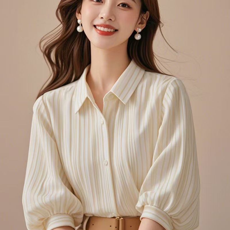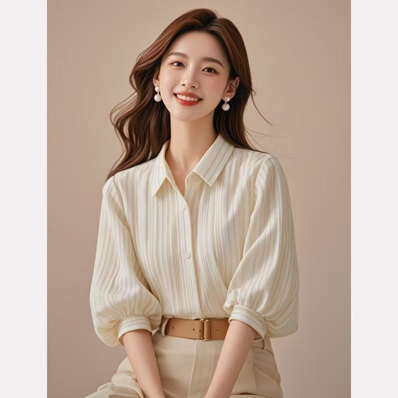 YF7559-(2色入内)高级感时尚蓝色条纹泡泡袖POLO领宽松显瘦漂亮法红式衬衣