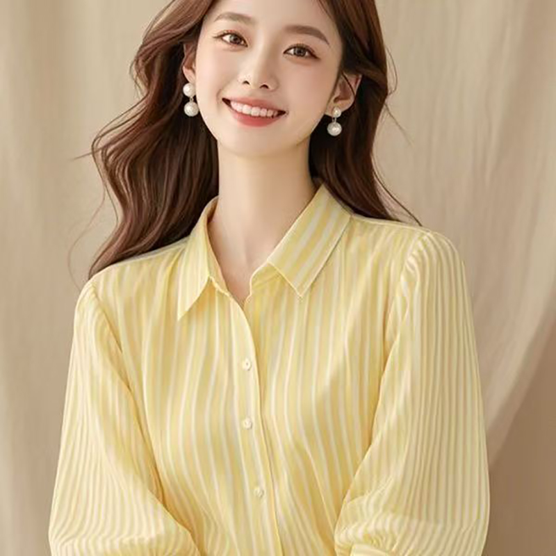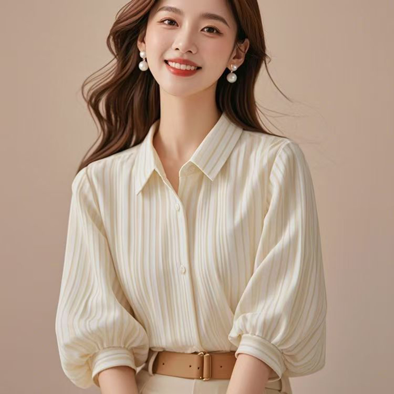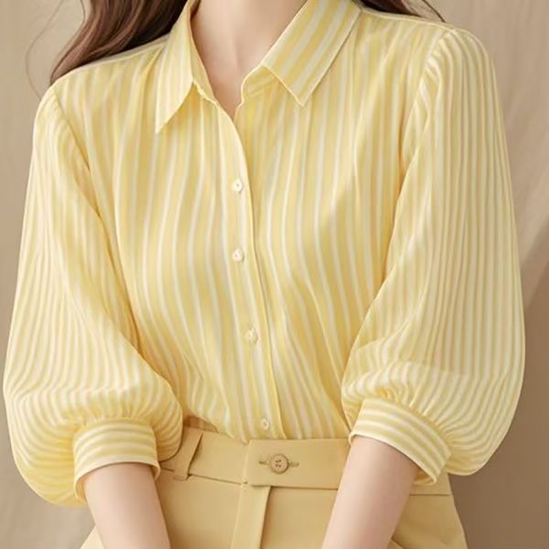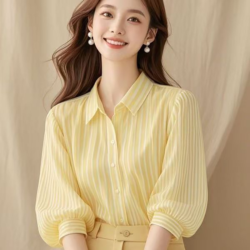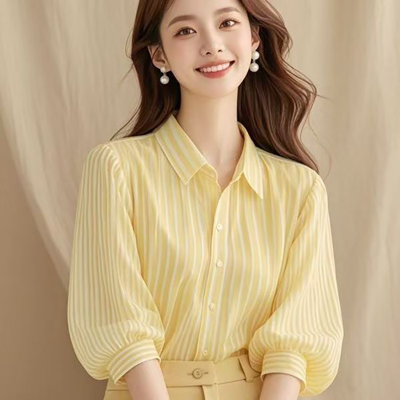 YF7560-(2色入内)甜美时尚POLO领灯笼袖宽松显瘦大码条纹法式雪纺上衣