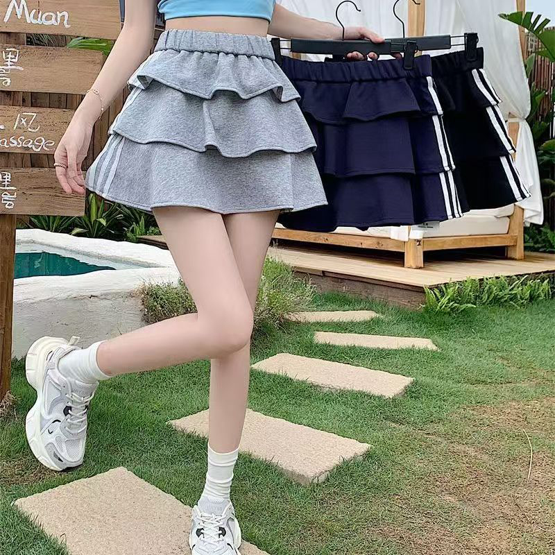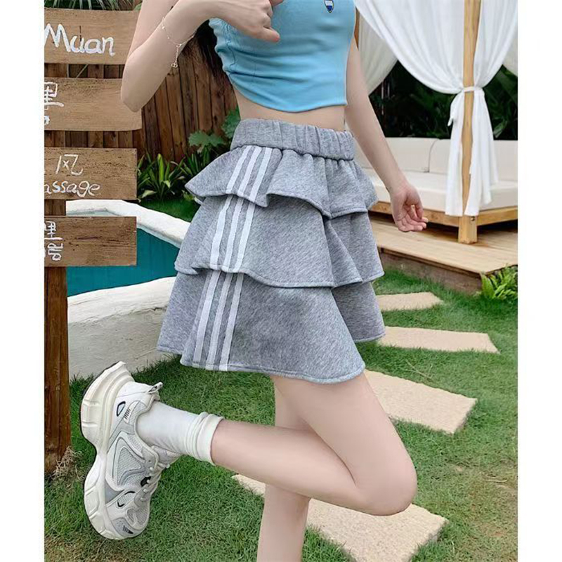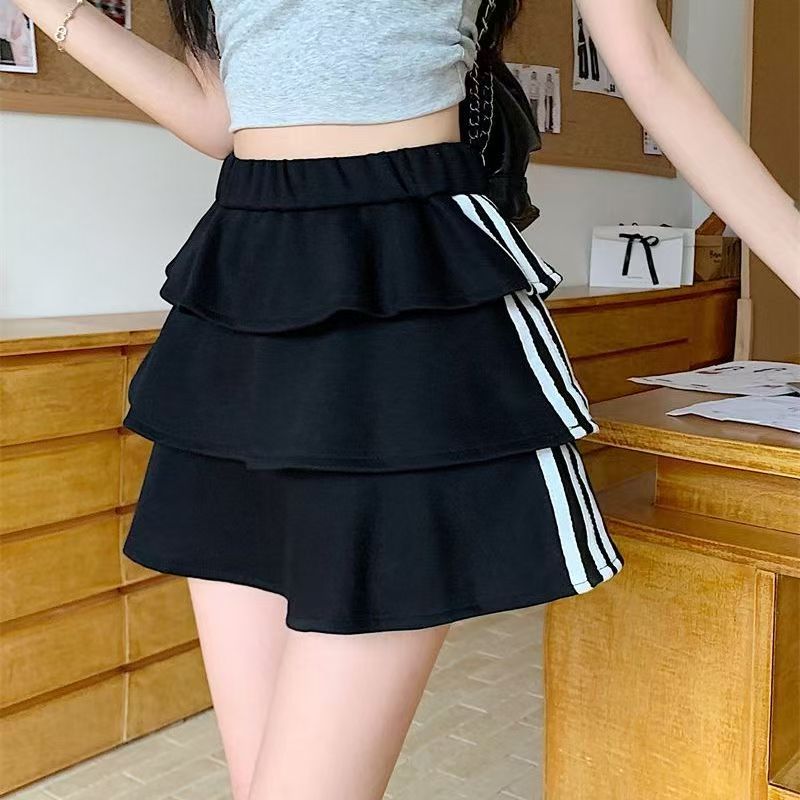 YF7561-(3色入内)时尚运动感松紧腰三层荷叶边撞色条纹防走光内衬蛋糕短裙