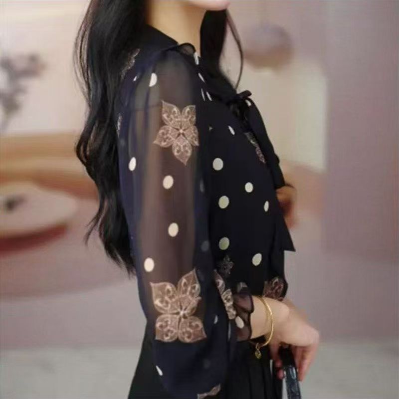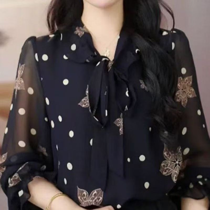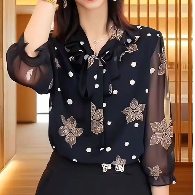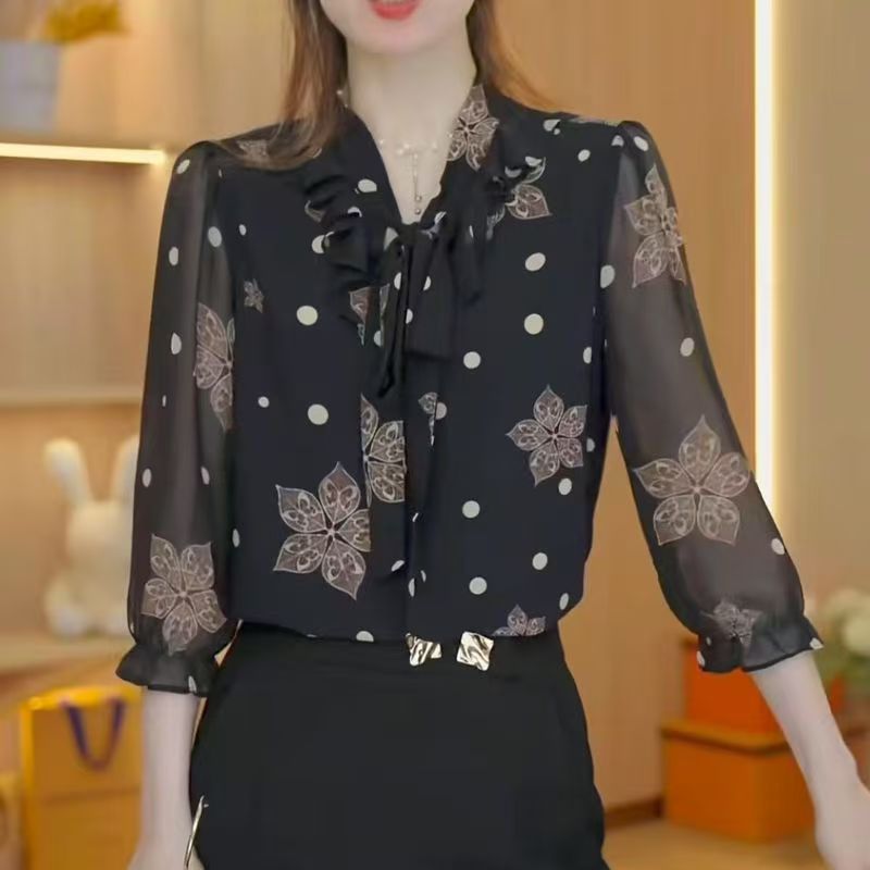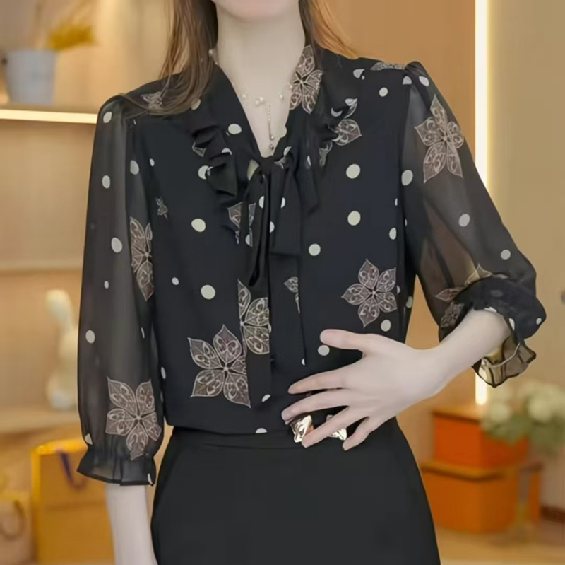 YF7563-图片色韩版夏季透视中袖系蝴蝶结碎花宽松大码雪纺上衣
