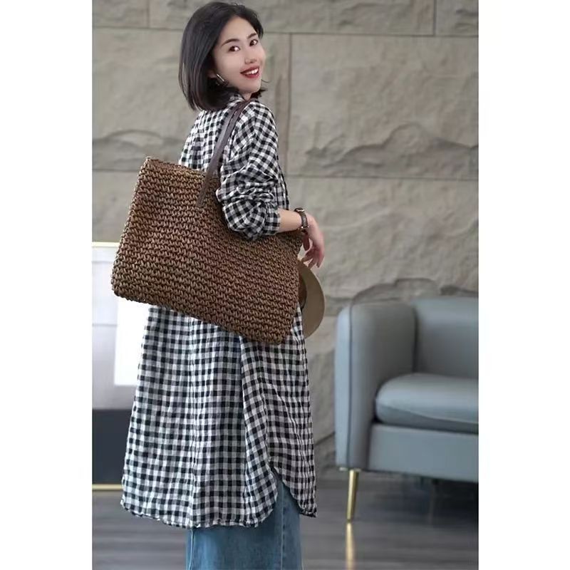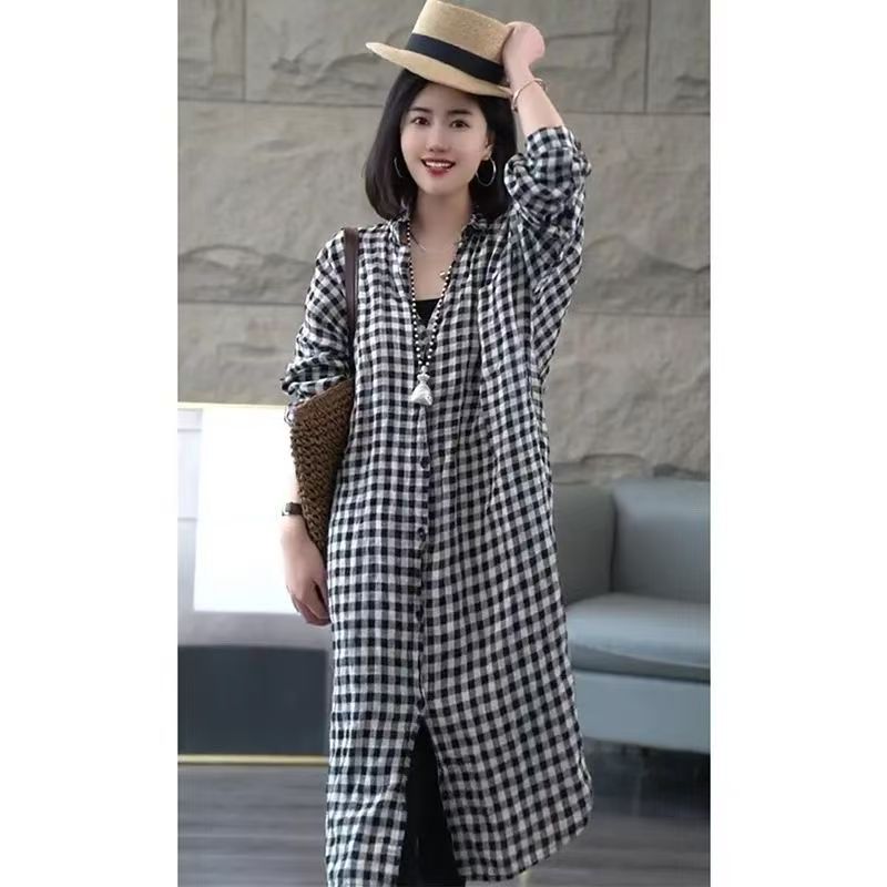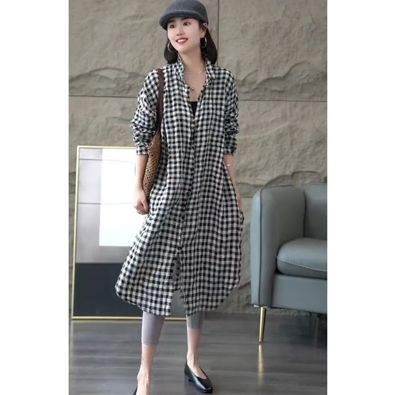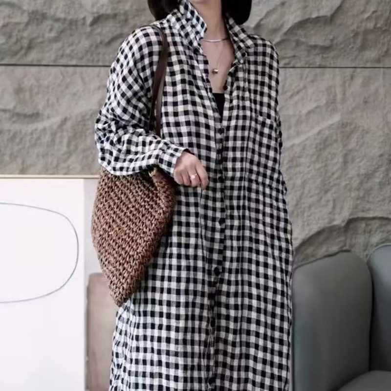 YF7571-图片色慵懒风中长款长袖翻领黑白格子弧边过膝大码显瘦上衣